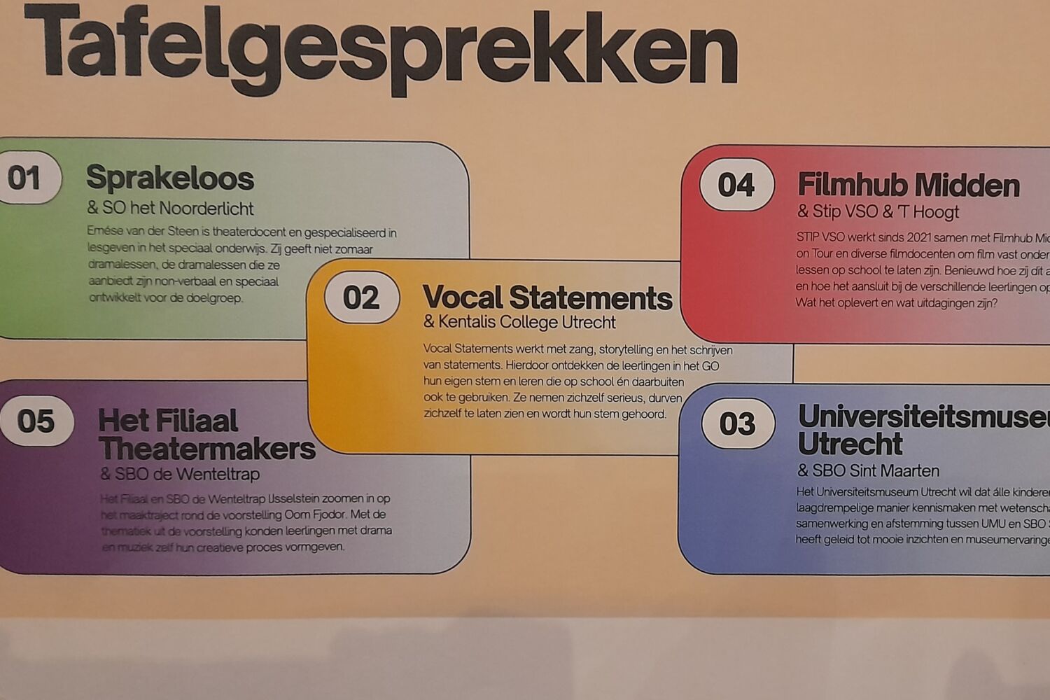 Na een korte pauze verspreiden de deelnemers zich over verschillende tafels voor een gesprek met een culturele partner en een GO-school over hun samenwerking. Er worden voorbeelden en ervaringen gedeeld. Wat werkt en waar lopen ze tegenaan? Iedere tafel deelt uiteindelijk plenair het meest bijzondere moment uit het gesprek: