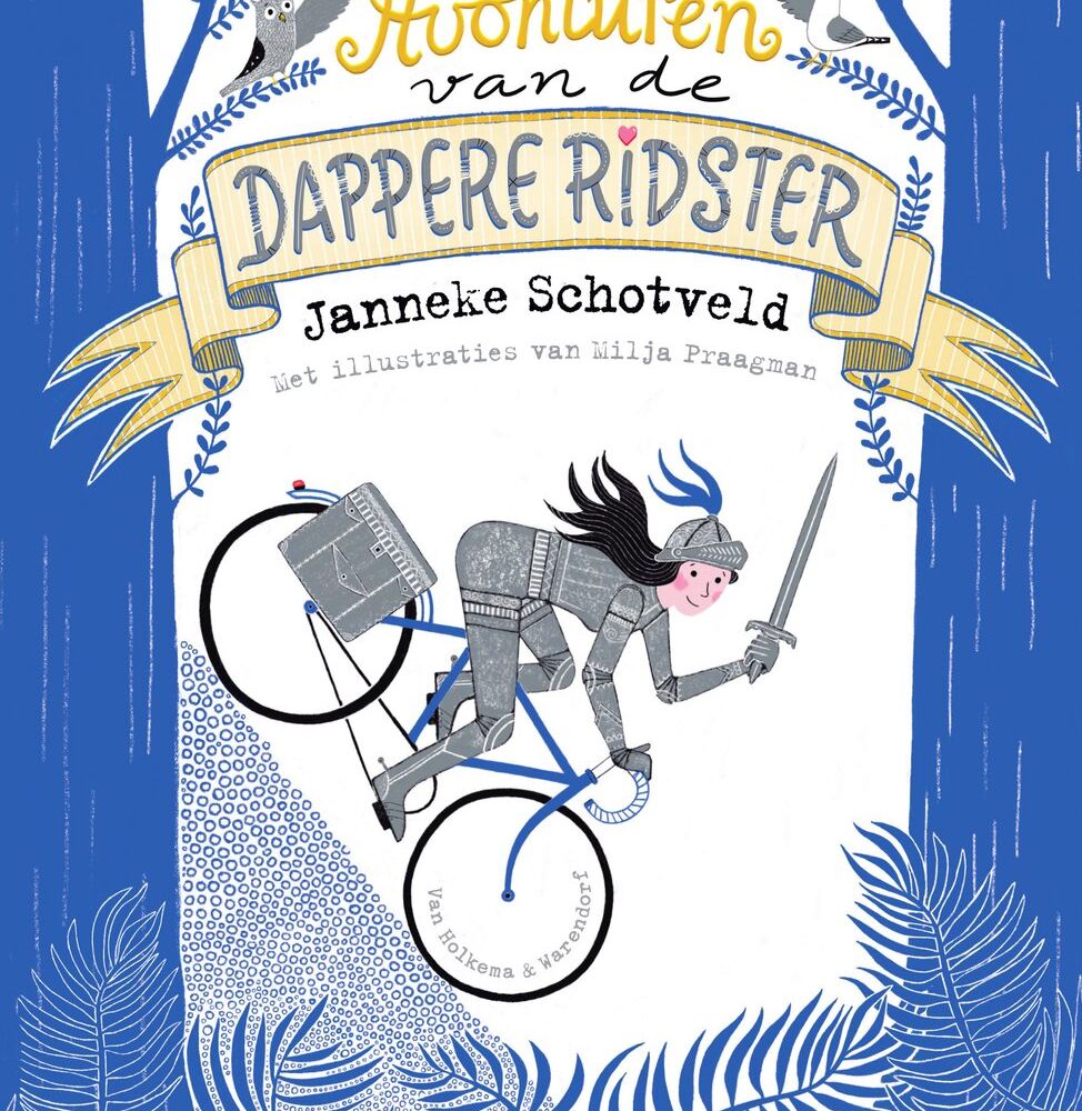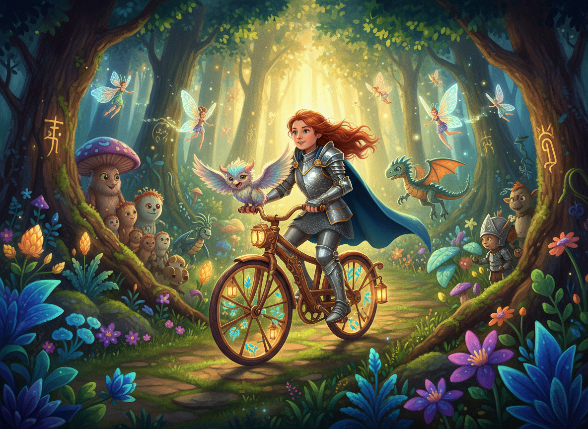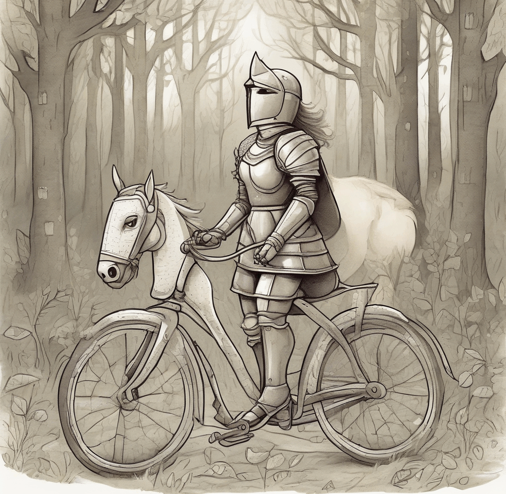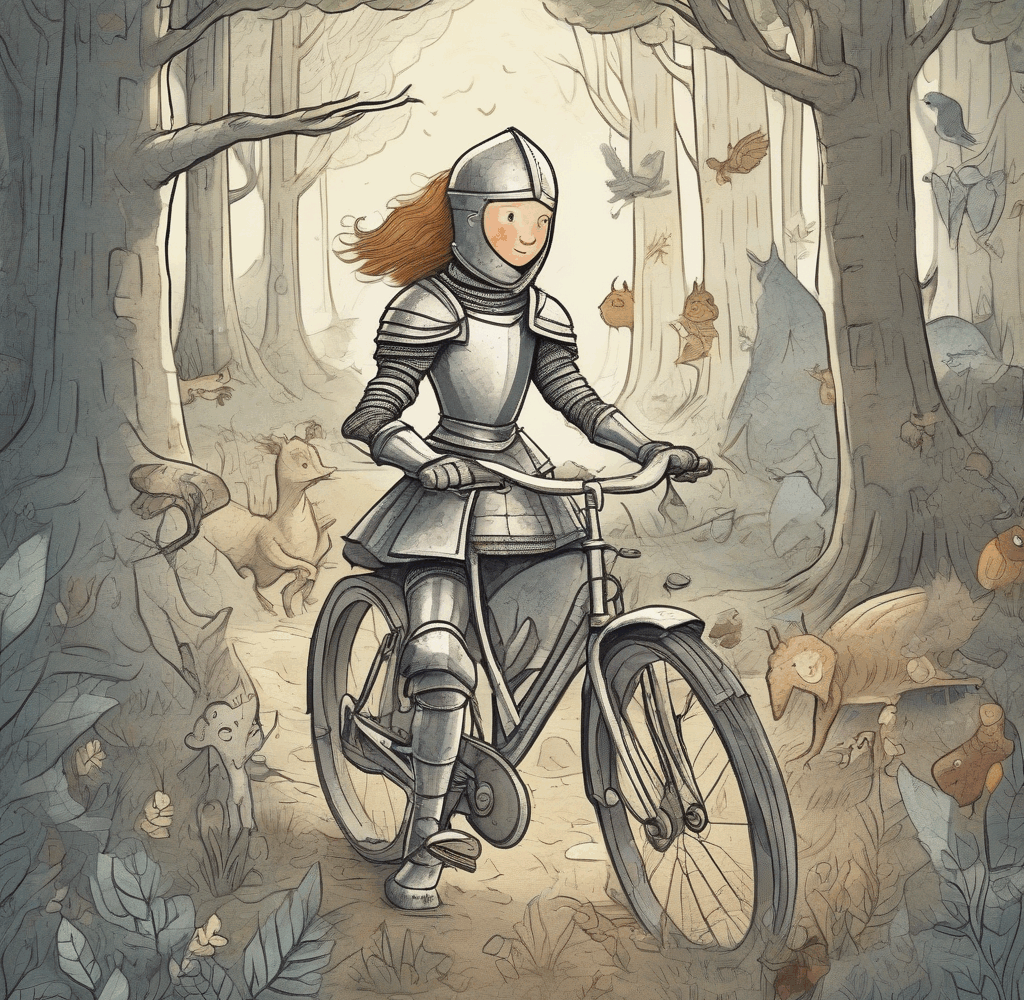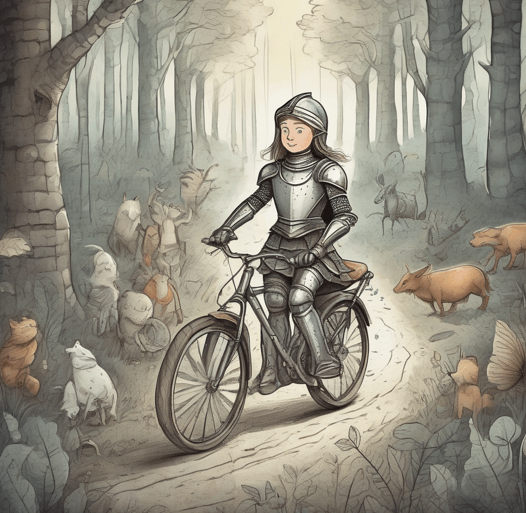 Met een AI afbeeldingen generator wil ik een boekomslag maken. Het gaat over een meisje dat een ridder is, en al fietsend maakt ze allerlei avonturen mee. Ze fietst door het donkere bos in haar ridderpak, maar ze is niet bang!