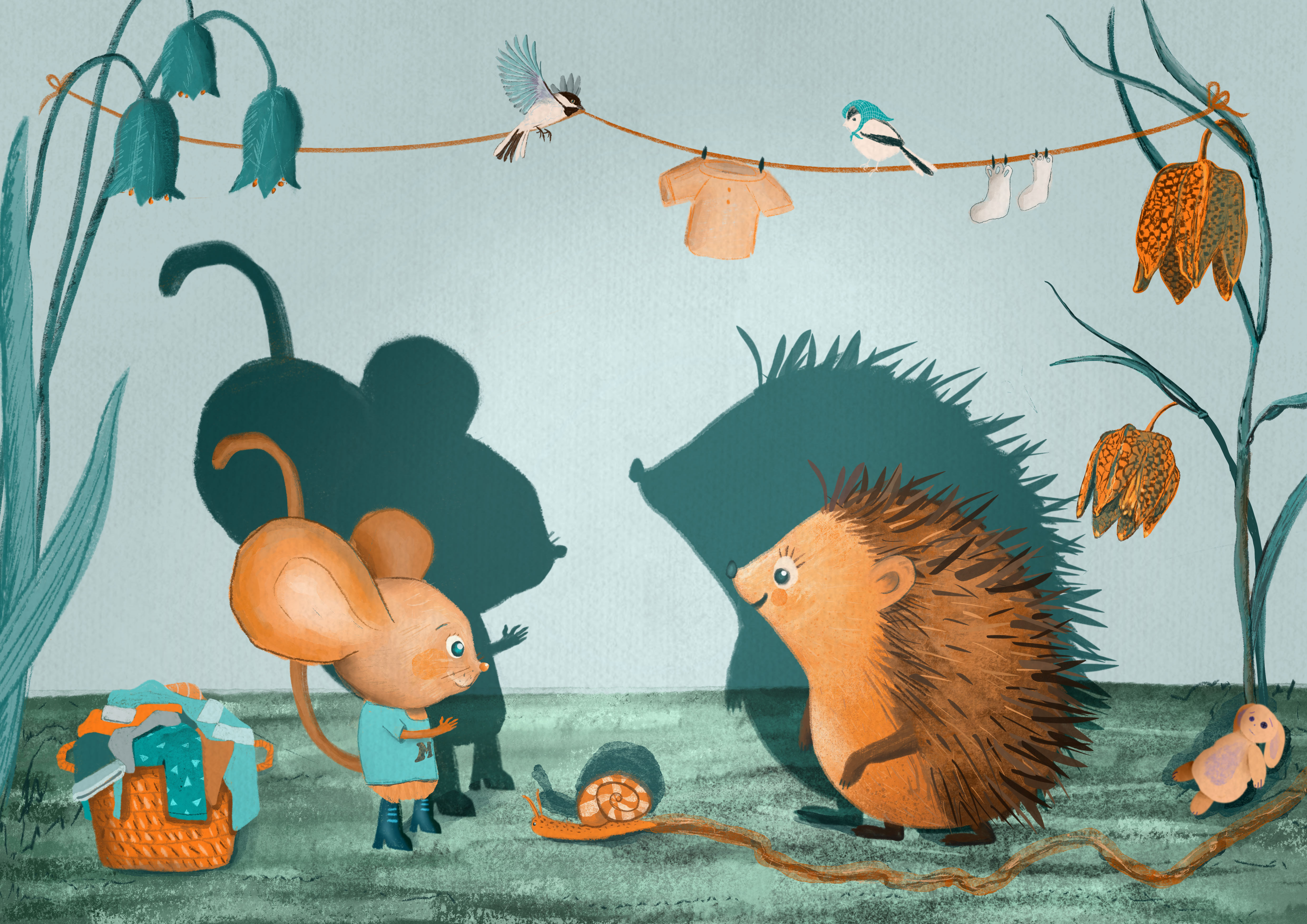 - print de 2 vertelplaten (Moos is bang – Moos en Egelientje) uit op A3, of laat ze zien op het digibord tijdens het lezen van het verhaal.