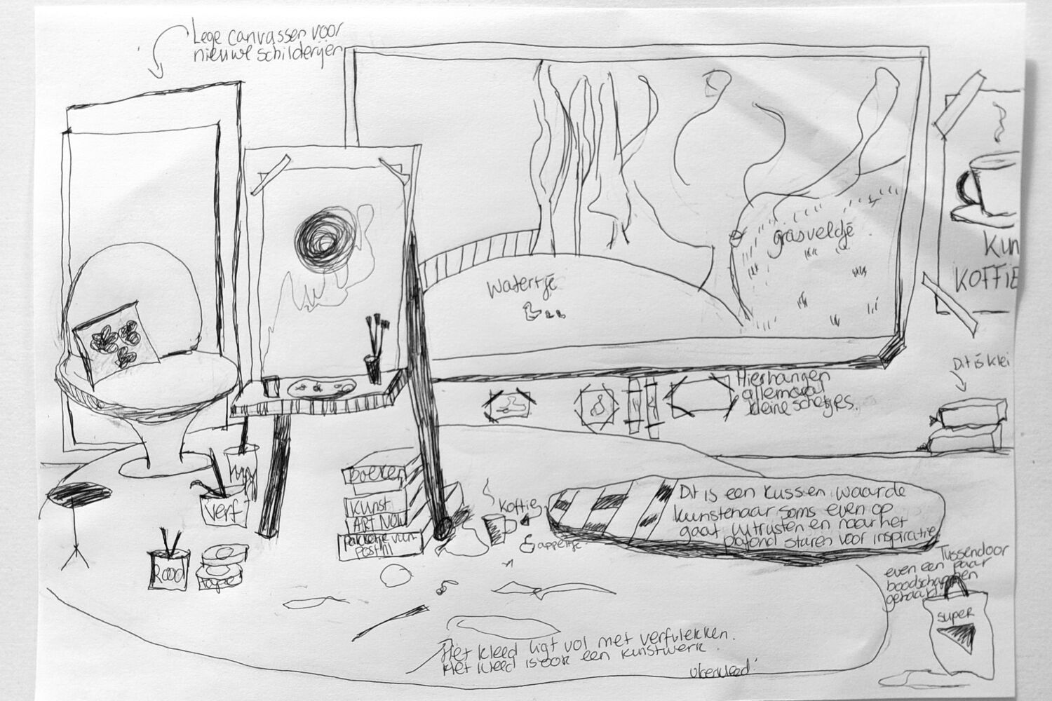 Op het vel papier dat je krijgt maak je samen en in overleg een schets tekening van hoe je denkt dat een atelier eruit ziet.