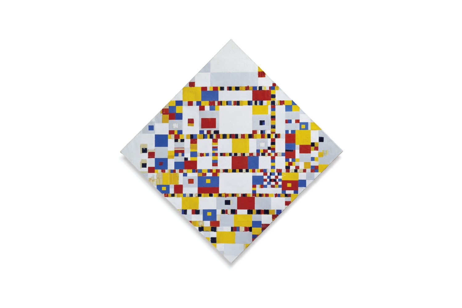 Mondriaan werkte 9 maanden lang intensief aan dit schilderij dat ‘Victory Boogie Woogie’ heet. Toen hij in 1944 in New York overleed, was het schilderij nog net niet helemaal af. De dikke zwarte lijnen uit zijn eerdere werk zijn weg. Het lijkt wel alsof de losse kleurvlakjes in beweging zijn!