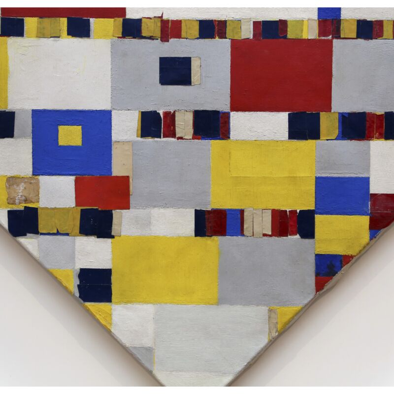 Maak de Victory Boogie Woogie af. Vervang alle stukjes tape door gekleurd papier. Knip eerst de stukjes papier en ga daarna schuiven totdat je tevreden bent. Plak ze pas op als je helemaal tevreden bent over het beeld.