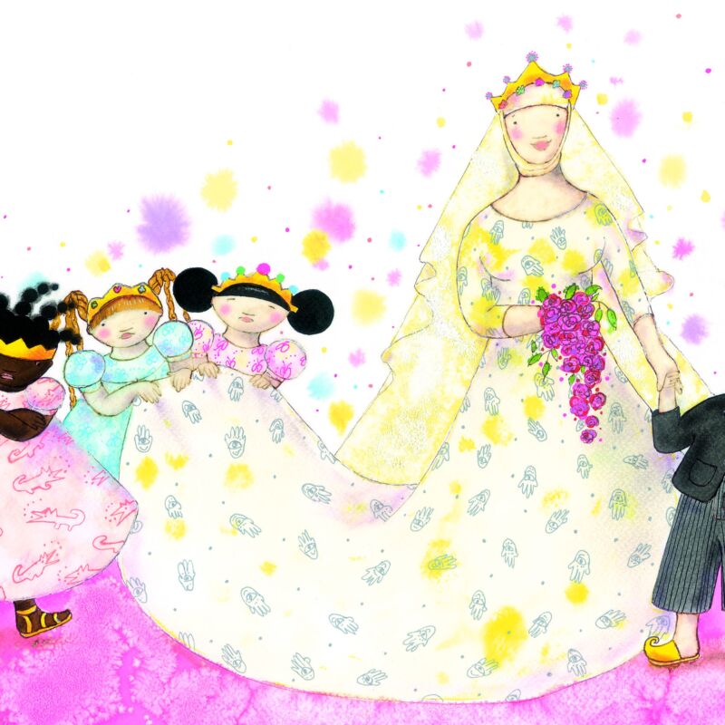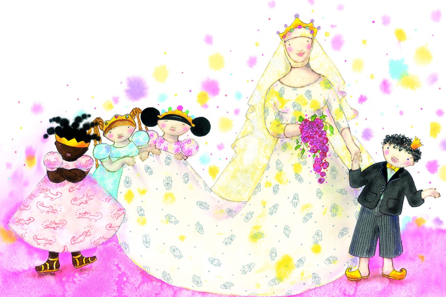 Deze laatste illustratie in het boek Prinses Arabella is verliefd biedt mogelijkheden tot vertellen. Zoek de pagina op in het boek en laat de kinderen vertellen wat ze zien en er verder bij fantaseren. Bijvoorbeeld vanuit de moeder van Prins Mimoen of Mimoen zelf.