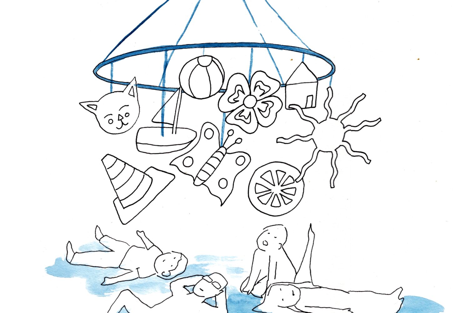 Daarna kruipen we in de rol van baby: Wat zou een baby zien als die eronder zou liggen? Ga heerlijk liggen en tuur naar boven..